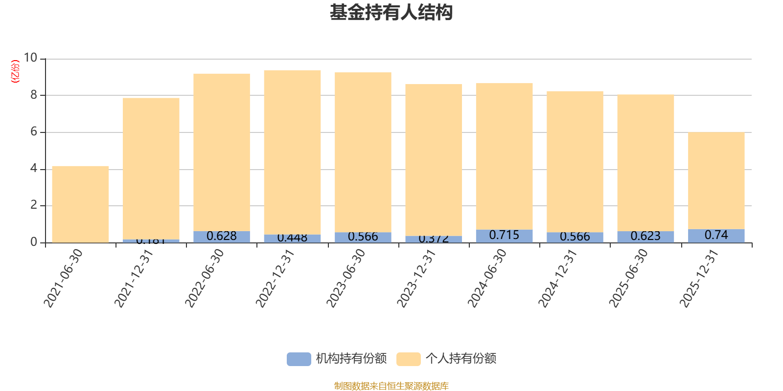 截至2025年12月31日,基金持有人共计2.02万户,合计持有6.01亿份。其中管理人员工持有155.34万份,占比0.26%,机构持有份额占比12.32%,个人投资者占比87.68%。