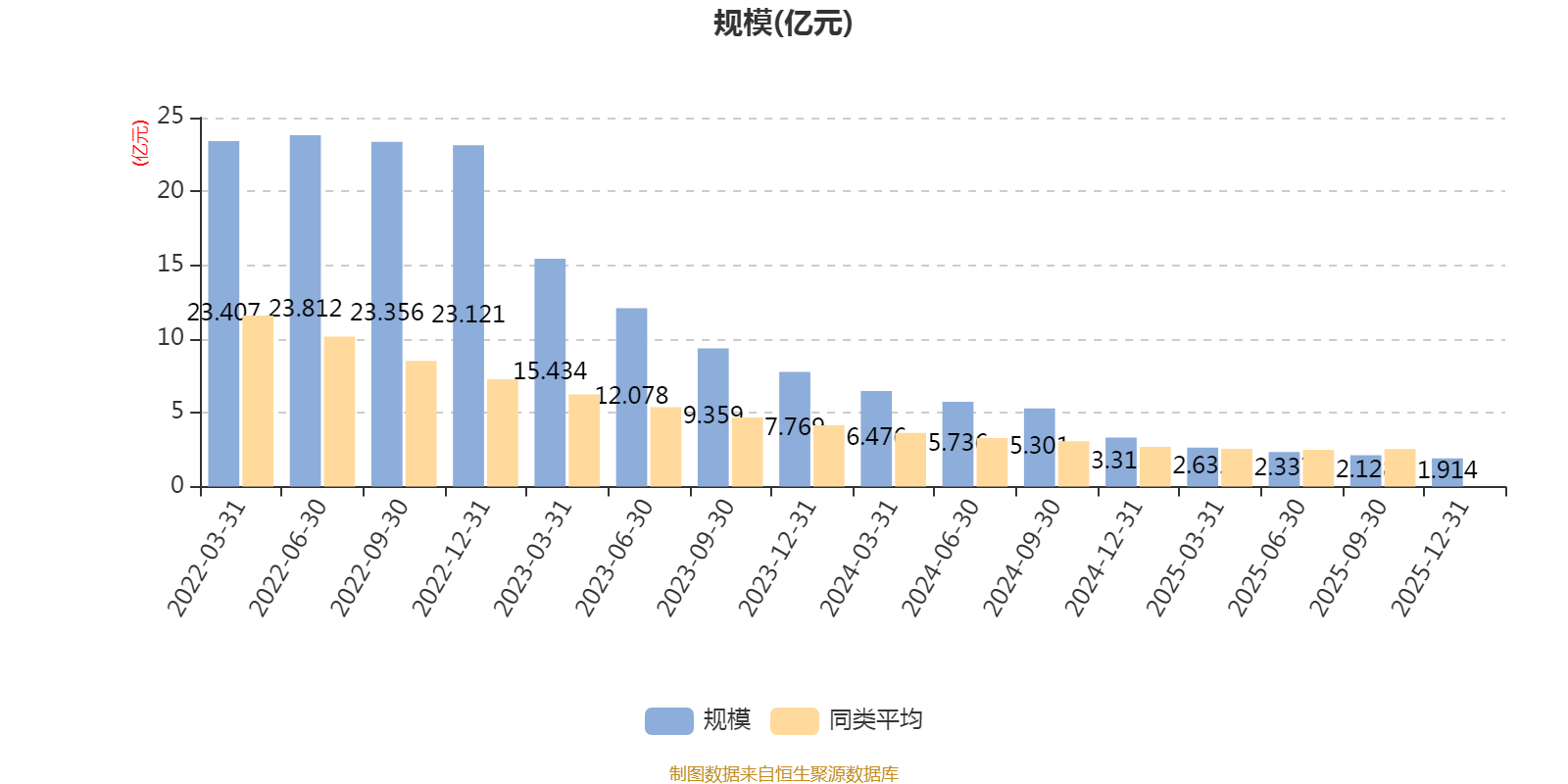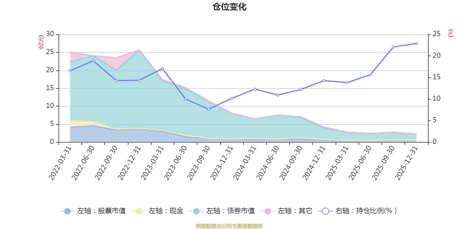 据定期报告数据统计,近三年平均股票仓位为14.08%,同类平均为19.2%。2025年末基金达到22.87%的最高仓位,2023年三季度末最低,为7.65%。