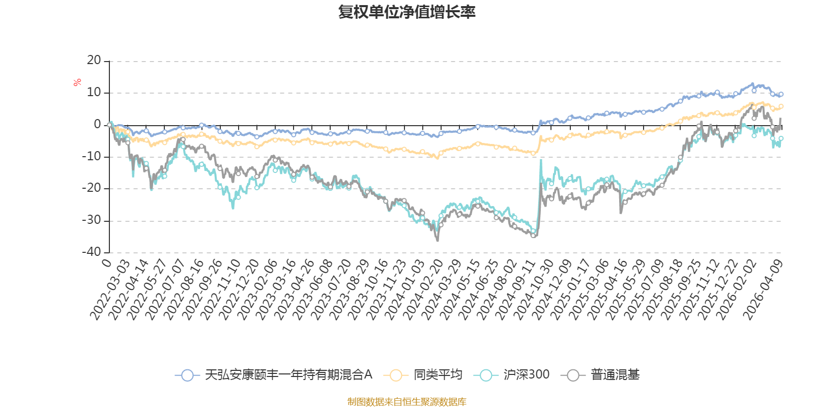 截至4月9日,天弘安康颐丰一年持有期混合A近三个月复权单位净值增长率为-1.30%,位于同类可比基金538/629;近半年复权单位净值增长率为-0.86%,位于同类可比基金518/629;近一年复权单位净值增长率为6.44%,位于同类可比基金355/629;近三年复权单位净值增长率为11.06%,位于同类可比基金276/581。