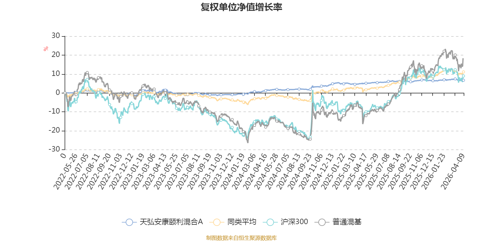 截至4月9日,天弘安康颐利混合A近三个月复权单位净值增长率为-0.05%,位于同类可比基金354/629;近半年复权单位净值增长率为0.57%,位于同类可比基金381/629;近一年复权单位净值增长率为1.65%,位于同类可比基金599/629;近三年复权单位净值增长率为4.66%,位于同类可比基金476/581。