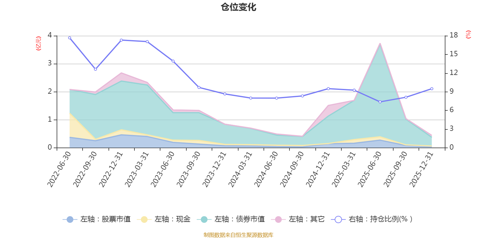 据定期报告数据统计,近三年平均股票仓位为9.77%,同类平均为19.2%。2022年上半年末基金达到17.66%的最高仓位,2025年上半年末最低,为7.37%。