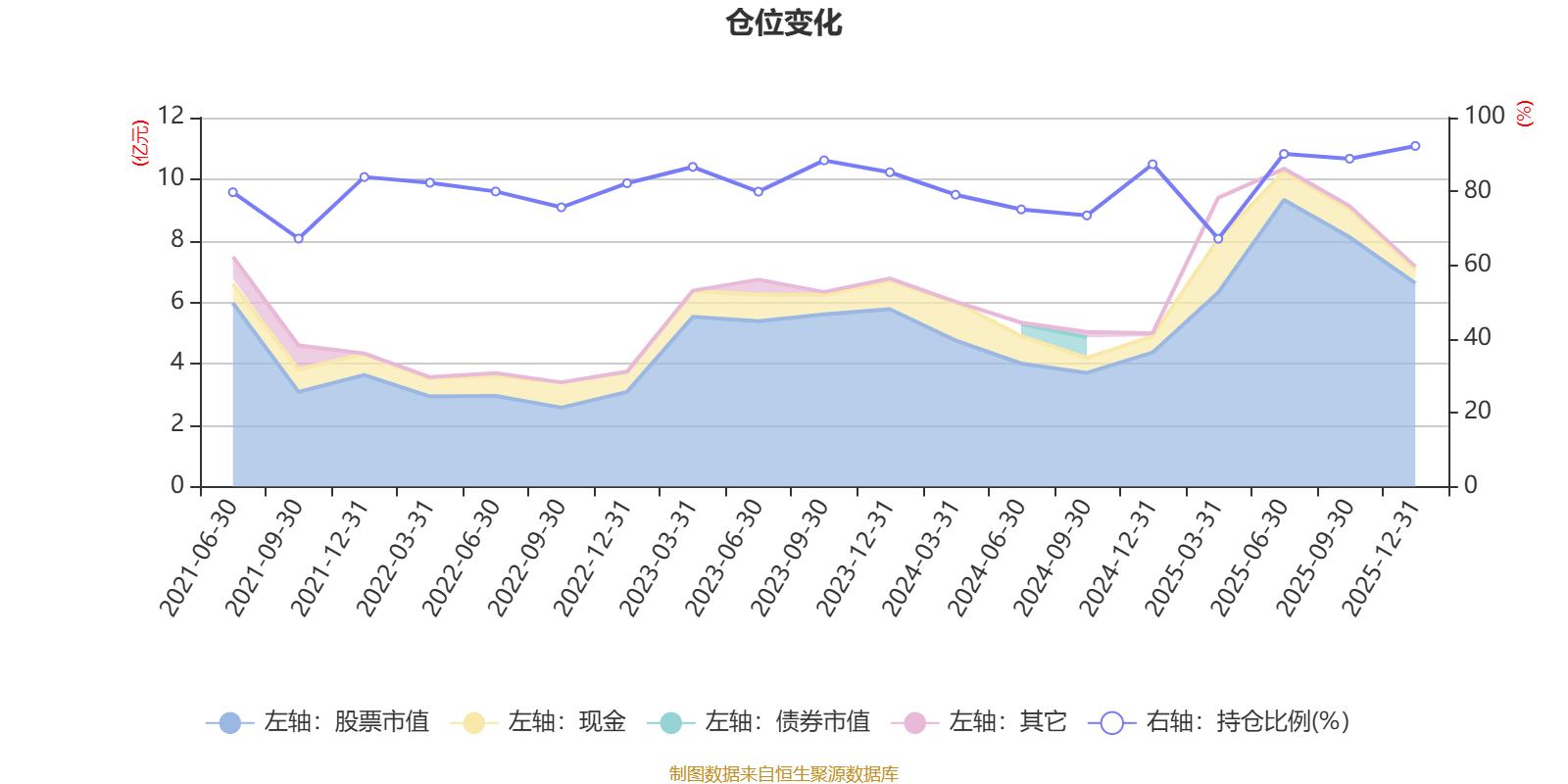 据定期报告数据统计,近三年平均股票仓位为82.81%,同类平均为86.9%。2025年末基金达到92.32%的最高仓位,2025年一季度末最低,为67.17%。