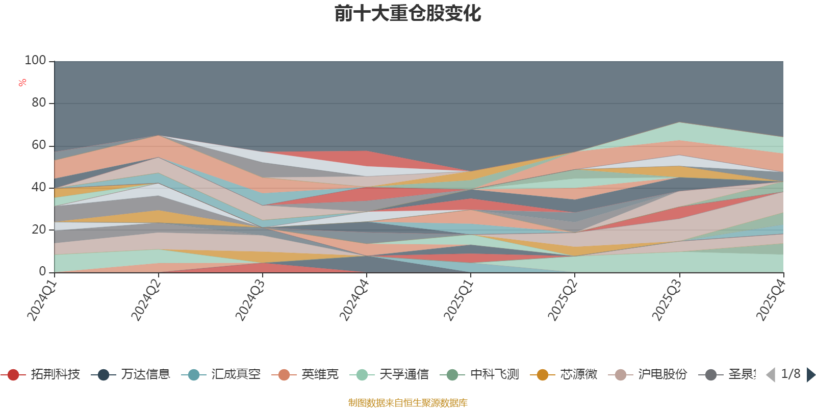 截至2025年末,基金十大重仓股分别是源杰科技、中际旭创、天孚通信、生益科技、德明利、中科飞测、仕佳光子、沪电股份、江波龙、北京君正。