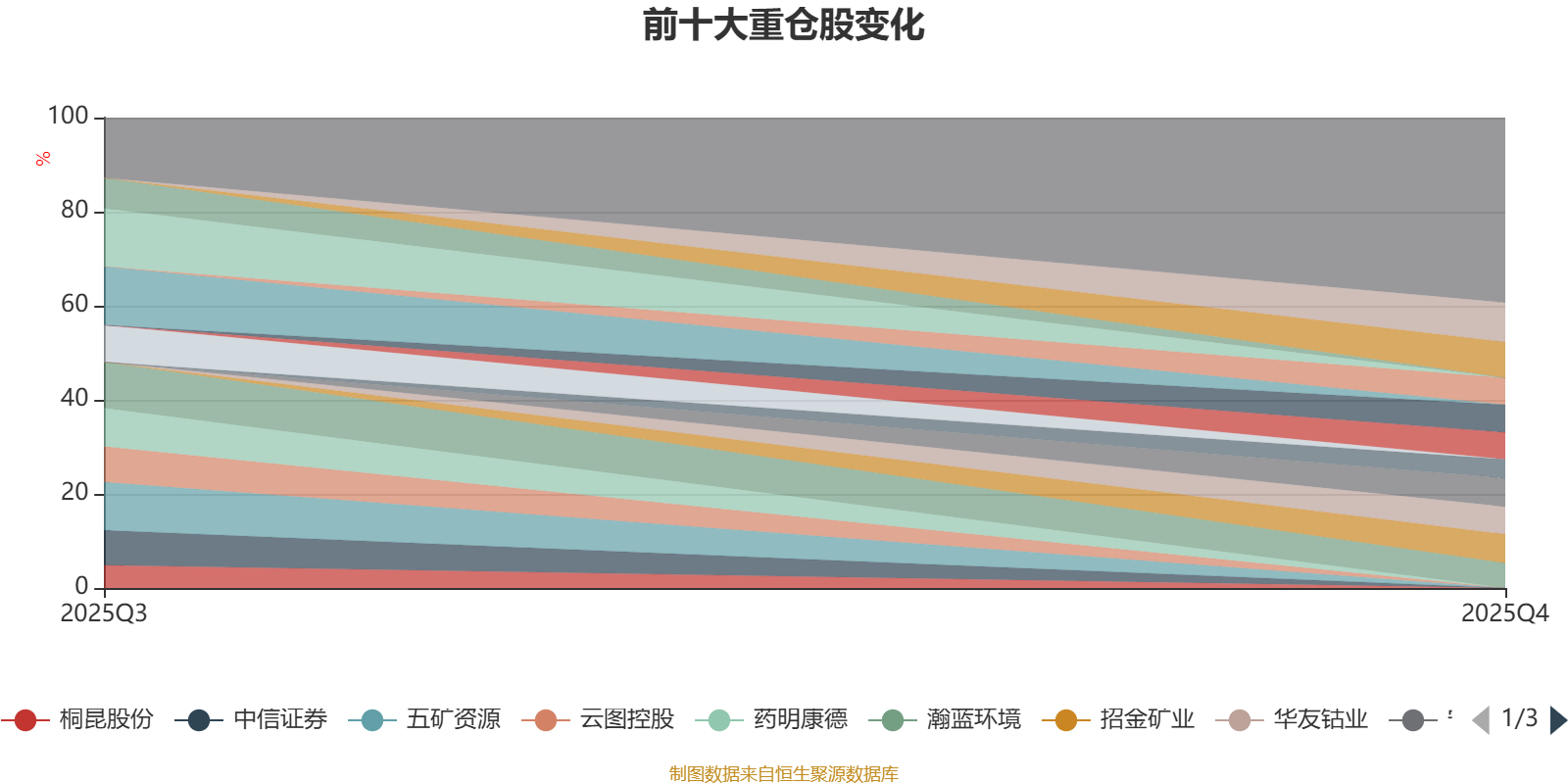 该基金持股集中度较高。截至2025年末,基金十大重仓股分别是江苏银行、上海银行、招金矿业、宁德时代、渝农商行、华友钴业、中国海洋石油、中伟新材、瀚蓝环境、格林美。