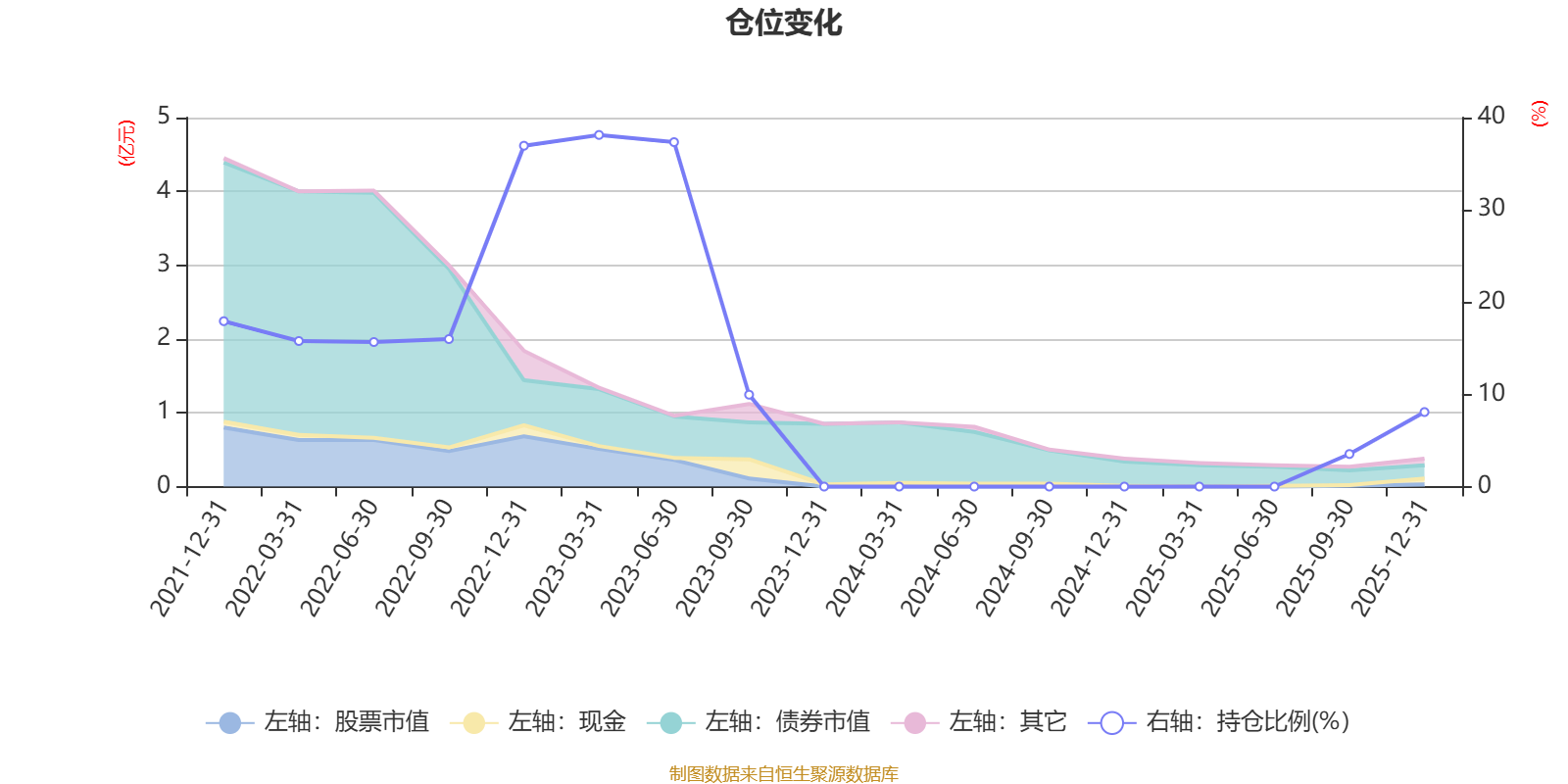 据定期报告数据统计,近三年平均股票仓位为8.09%,同类平均为19.42%。2023年一季度末基金达到38.12%的最高仓位,2025年三季度末最低,为3.53%。