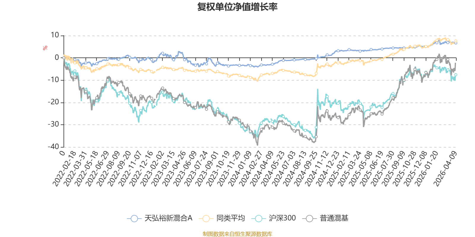截至4月9日,天弘裕新混合A近三个月复权单位净值增长率为0.17%,位于同类可比基金328/664;近半年复权单位净值增长率为1.80%,位于同类可比基金234/664;近一年复权单位净值增长率为3.38%,位于同类可比基金520/664;近三年复权单位净值增长率为3.70%,位于同类可比基金514/643。