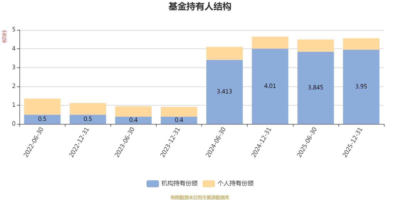 截至2025年12月31日,基金持有人共计823户,合计持有4.56亿份。其中管理人员工持有577.47万份,占比1.27%,机构持有份额占比86.66%,个人投资者占比13.34%。