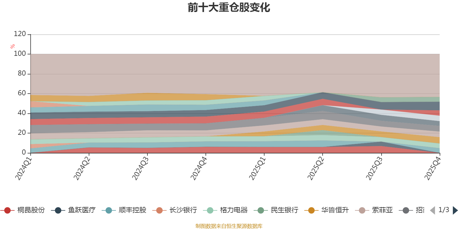 该基金持股集中度较高。截至2025年末,基金十大重仓股分别是万华化学、华鲁恒升、招商银行、索菲亚、五粮液、伊利股份、三一重工、格力电器、中国海外发展、顺丰控股。