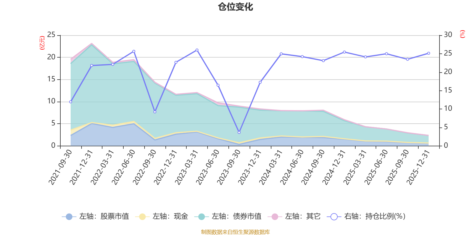 据定期报告数据统计,近三年平均股票仓位为21.56%,同类平均为19.2%。2023年一季度末基金达到25.99%的最高仓位,2023年三季度末最低,为3.64%。