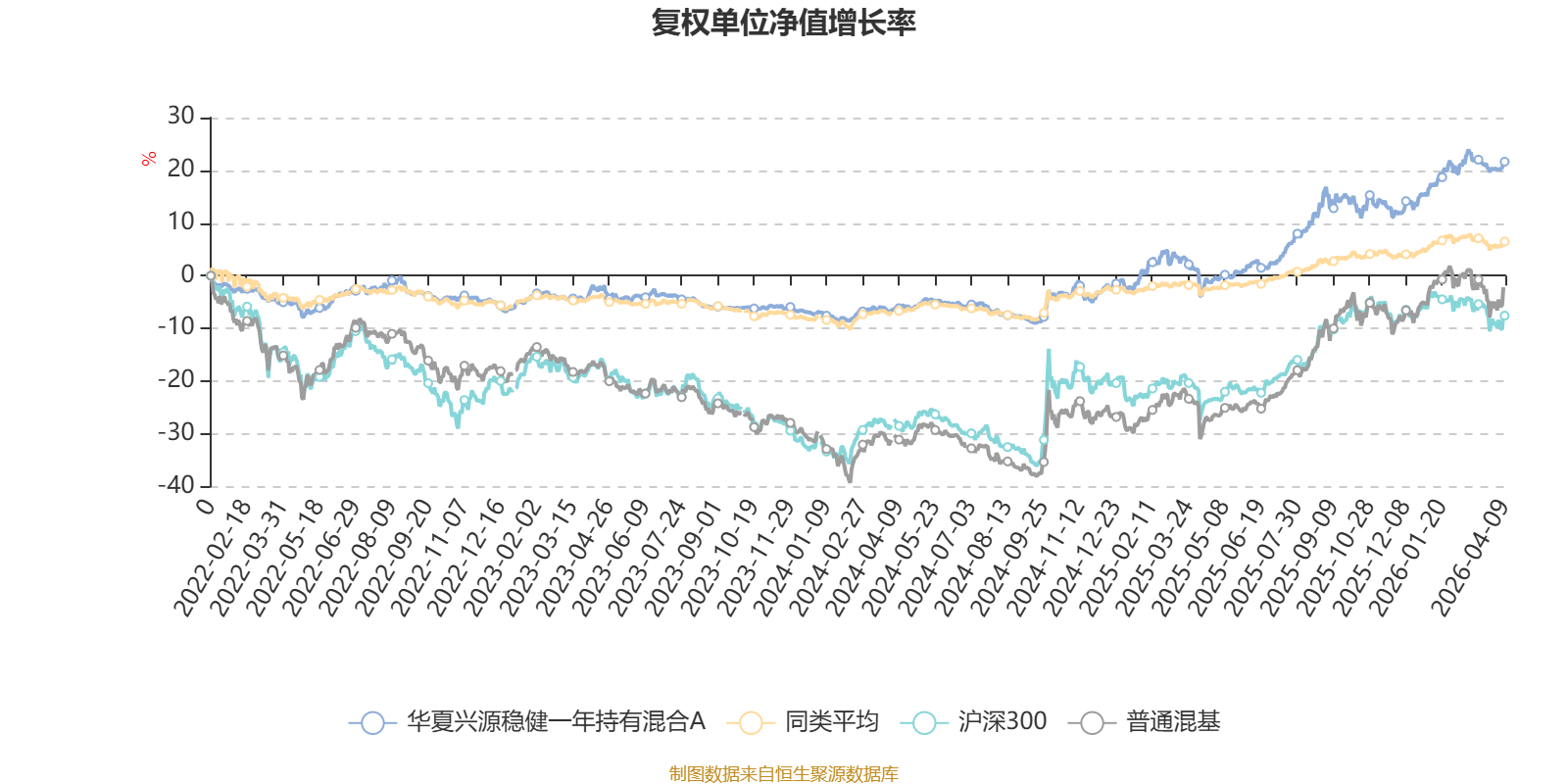 截至4月9日,华夏兴源稳健一年持有混合A近三个月复权单位净值增长率为3.60%,位于同类可比基金20/629;近半年复权单位净值增长率为5.67%,位于同类可比基金36/629;近一年复权单位净值增长率为25.51%,位于同类可比基金21/629;近三年复权单位净值增长率为23.87%,位于同类可比基金45/581。