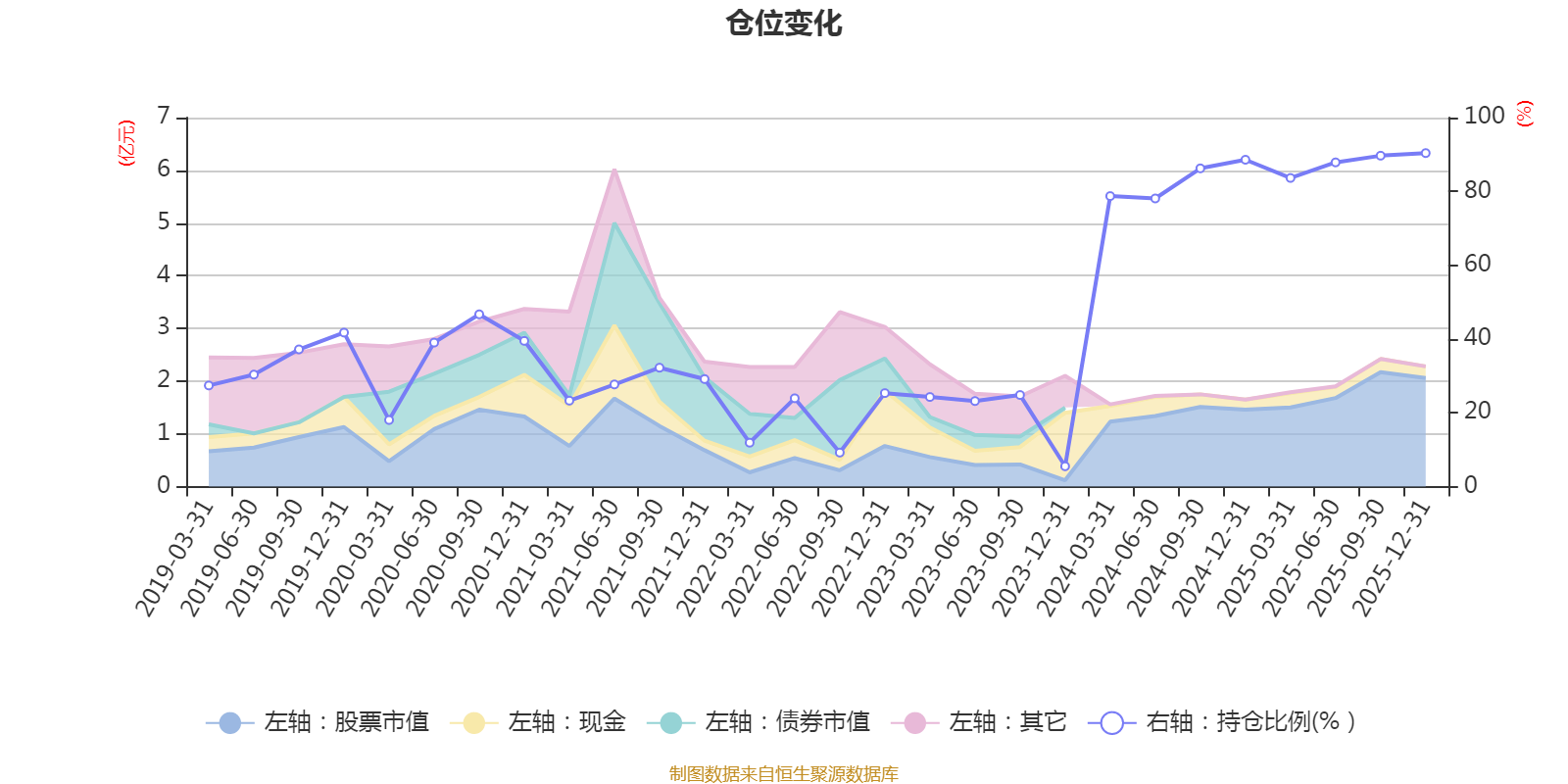 据定期报告数据统计,近三年平均股票仓位为63.42%,同类平均为72.57%。2025年末基金达到90.38%的最高仓位,2023年末最低,为5.5%。