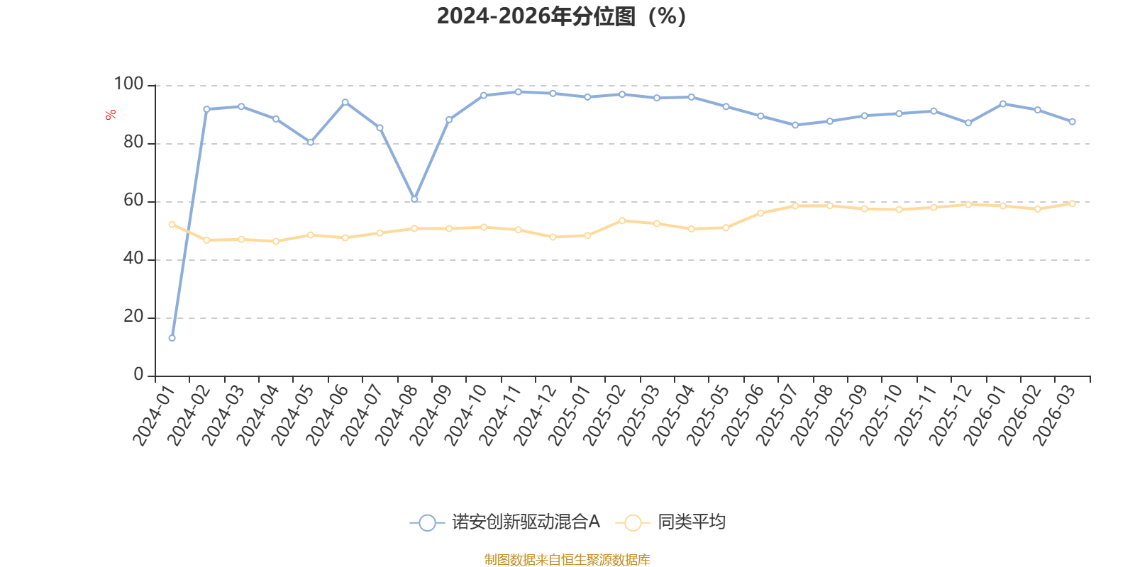 通过所选区间该基金净值增长率分位图,可以观察该基金与同类基金业绩比较情况。图为坐标原点到区间内某时点的净值增长率在同类基金中的分位数。