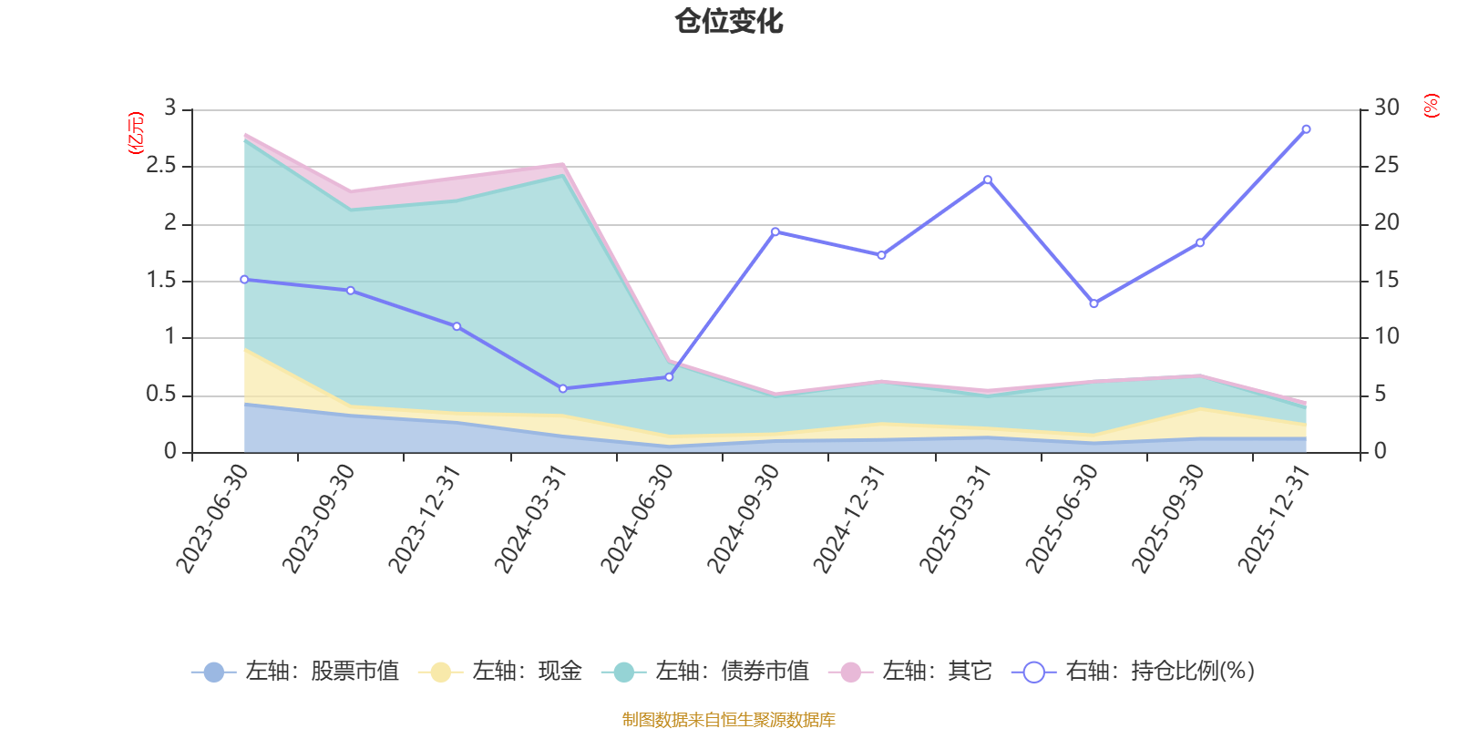 据定期报告数据统计,成立以来平均股票仓位为15.68%,同类平均为19.2%。2025年末基金达到28.27%的最高仓位,2024年一季度末最低,为5.58%。