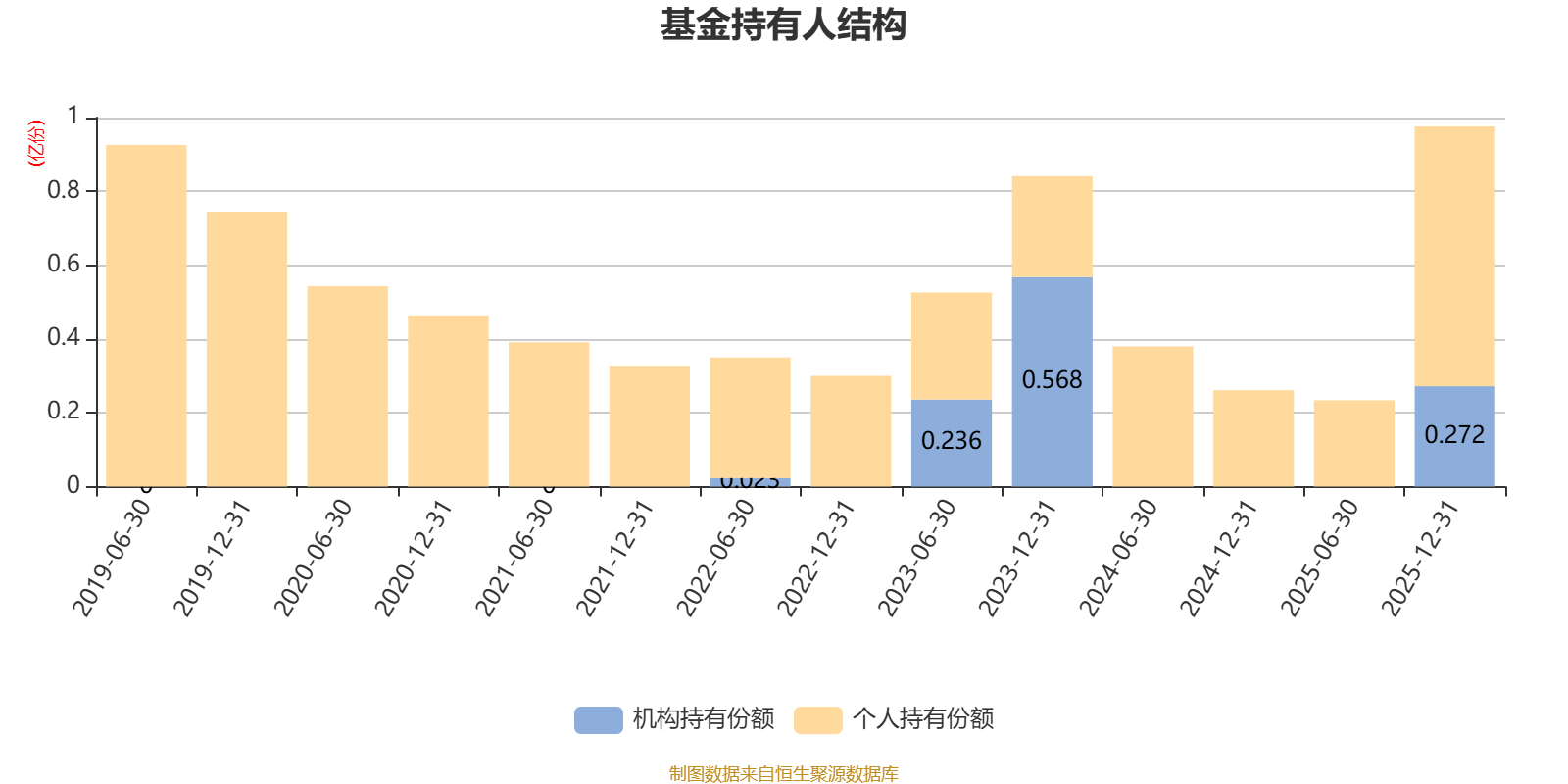 截至2025年12月31日,基金持有人共计4441户,合计持有9767.66万份。其中管理人员工持有26.98万份,占比0.28%,机构持有份额占比27.90%,个人投资者占比72.10%。