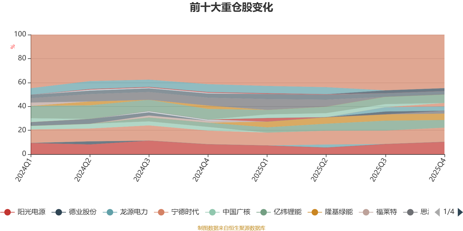 该基金持股集中度较高。截至2025年末,基金十大重仓股分别是宁德时代、阳光电源、长江电力、亿纬锂能、隆基绿能、天赐材料、特变电工、拓普集团、思源电气、通威股份。