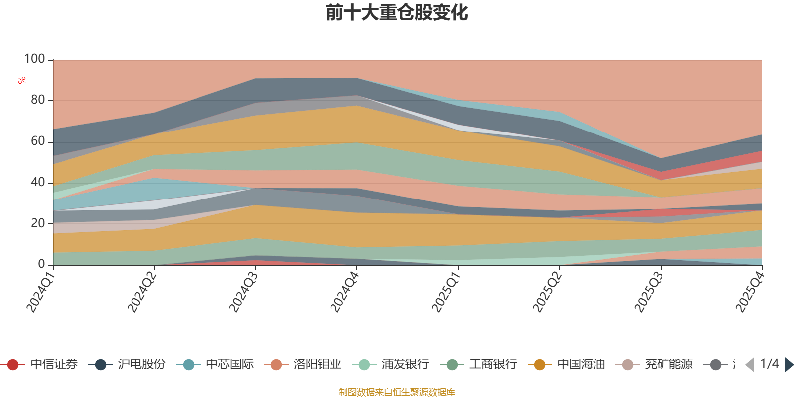 该基金持股集中度较高。截至2025年末,基金十大重仓股分别是中国海油、中国神华、工商银行、建设银行、美的集团、洛阳钼业、紫金矿业、立讯精密、长江电力、中芯国际。