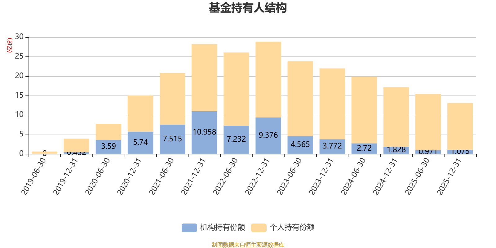 截至2025年12月31日,基金持有人共计9.78万户,合计持有13.07亿份。其中管理人员工持有706.26万份,占比0.54%,机构持有份额占比8.22%,个人投资者占比91.78%。