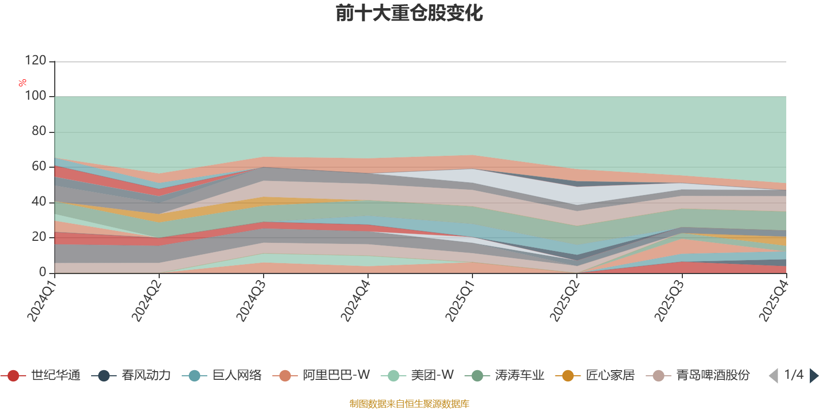 该基金持股集中度较高。截至2025年末,基金十大重仓股分别是腾讯控股、美的集团、匠心家居、巨人网络、嘉益股份、春风动力、世纪华通、上美股份、贵州茅台、涛涛车业。