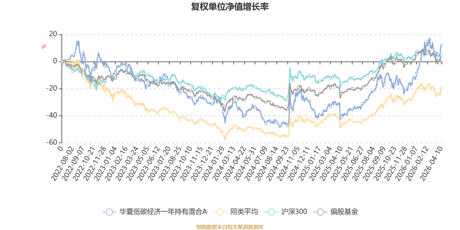 截至4月10日,华夏低碳经济一年持有混合A近三个月复权单位净值增长率为20.49%,位于同类可比基金2/100;近半年复权单位净值增长率为32.69%,位于同类可比基金6/100;近一年复权单位净值增长率为88.64%,位于同类可比基金4/99;近三年复权单位净值增长率为28.27%,位于同类可比基金23/76。