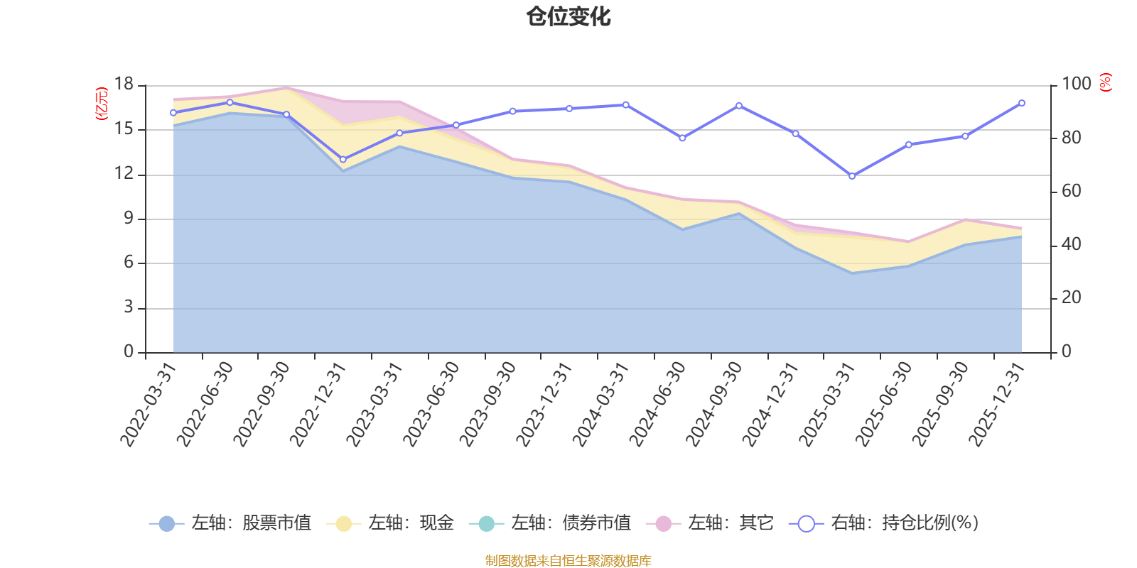 据定期报告数据统计,近三年平均股票仓位为84.49%,同类平均为86.12%。2022年上半年末基金达到93.58%的最高仓位,2025年一季度末最低,为66%。
