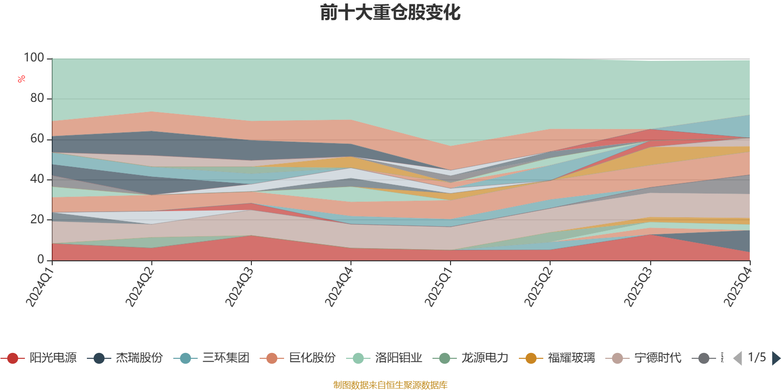 该基金持股集中度较高。截至2025年末,基金十大重仓股分别是宁德时代、思源电气、紫金矿业、杰瑞股份、藏格矿业、三美股份、阳光电源、福耀玻璃、洛阳钼业、亿纬锂能。