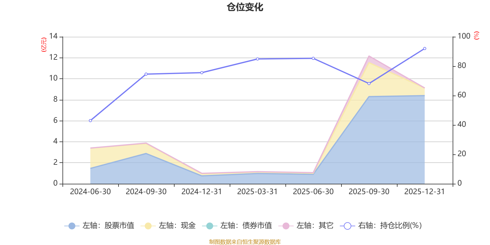 据定期报告数据统计,成立以来平均股票仓位为74.79%,同类平均为86.9%。2025年末基金达到92%的最高仓位,2024年上半年末最低,为42.96%。