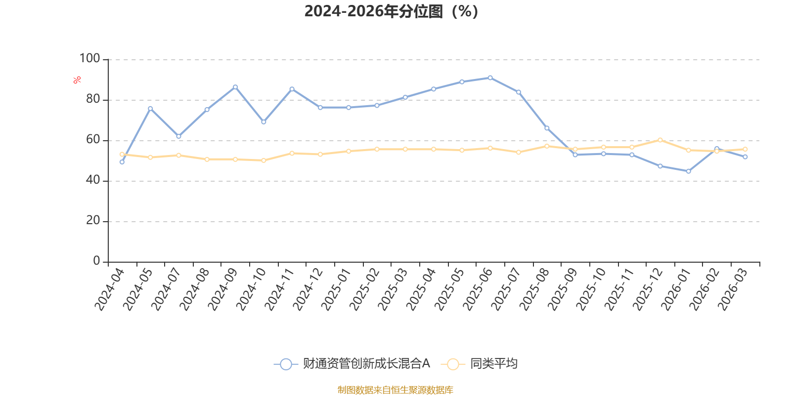 通过所选区间该基金净值增长率分位图,可以观察该基金与同类基金业绩比较情况。图为坐标原点到区间内某时点的净值增长率在同类基金中的分位数。