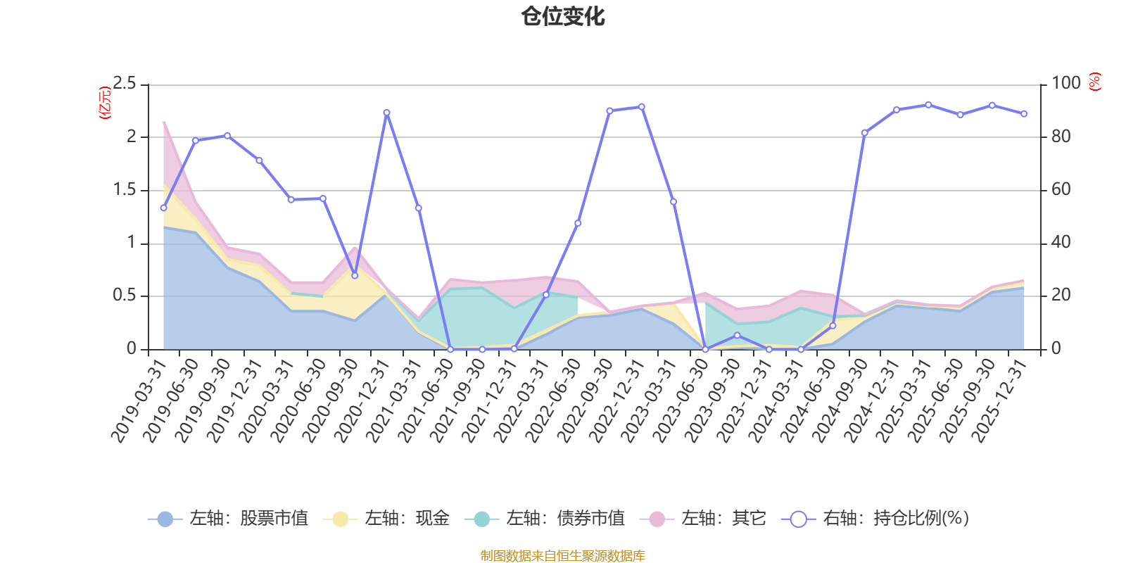 据定期报告数据统计,近三年平均股票仓位为50.34%,同类平均为72.57%。2025年一季度末基金达到92.32%的最高仓位,2021年末最低,为0.25%。