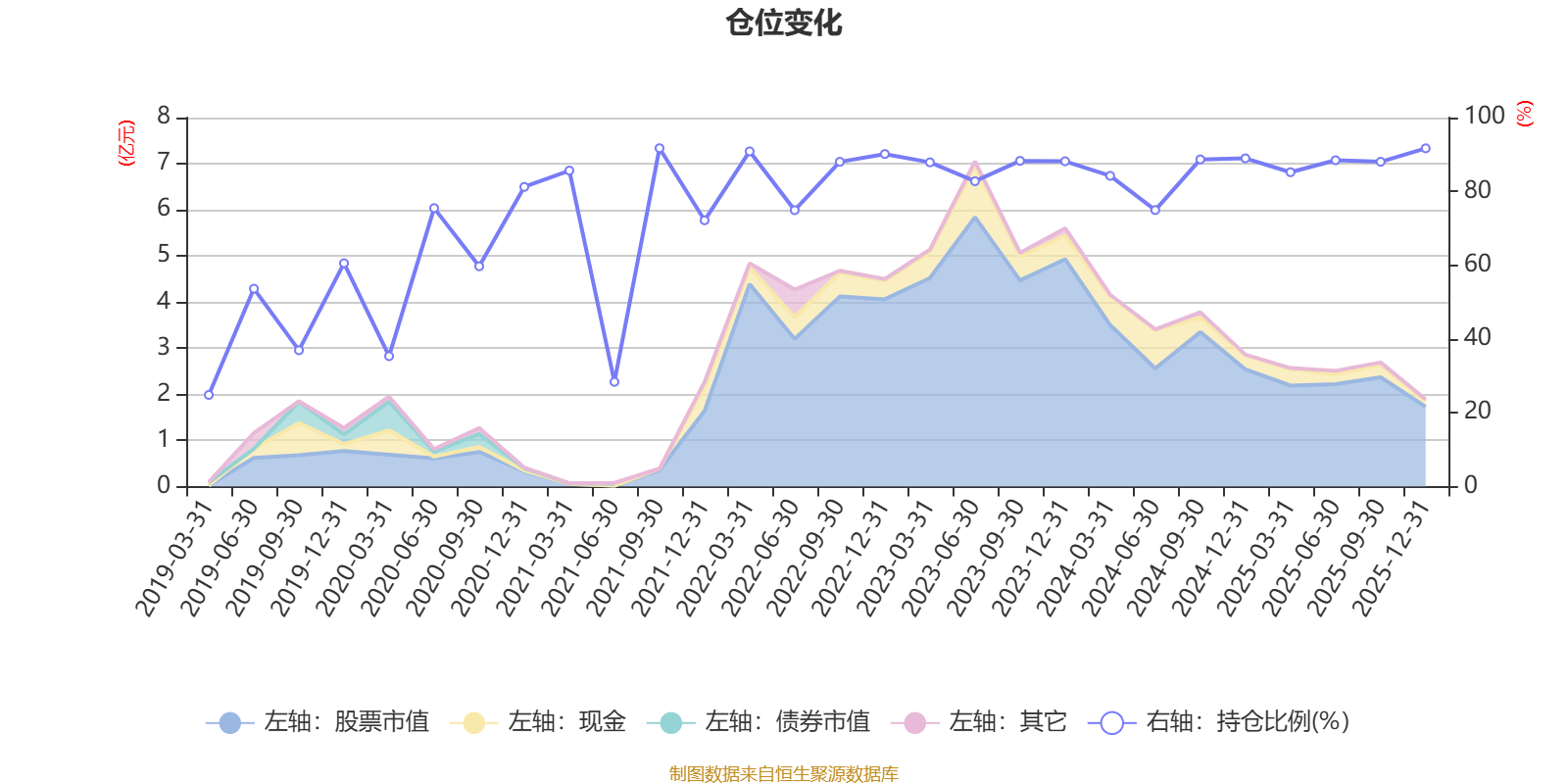 据定期报告数据统计,近三年平均股票仓位为86.44%,同类平均为72.57%。2021年三季度末基金达到91.7%的最高仓位,2019年一季度末最低,为24.84%。