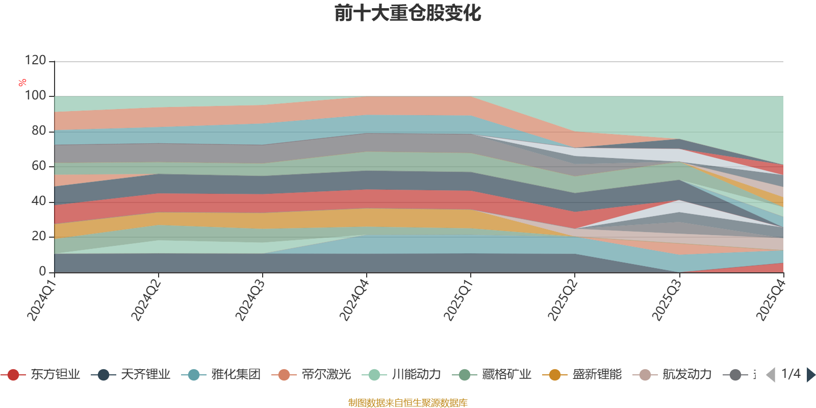 该基金持股集中度较高,近2年前十大重仓股集中度长期超过60%。截至2025年末,基金十大重仓股分别是雅化集团、航发动力、中国稀土、中稀有色、扬农化工、洪都航空、华鲁恒升、中航沈飞、华泰证券、东方钽业。