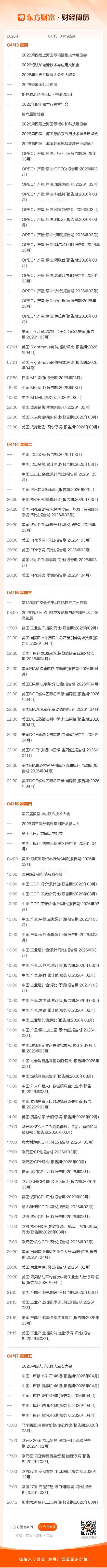 东方财富财经周历(4.13-4.19)