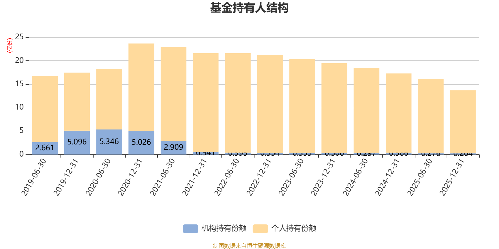 截至2025年12月31日,基金持有人共计47.54万户,合计持有13.7亿份。其中管理人员工持有40.03万份,占比0.03%,机构持有份额占比1.93%,个人投资者占比98.07%。