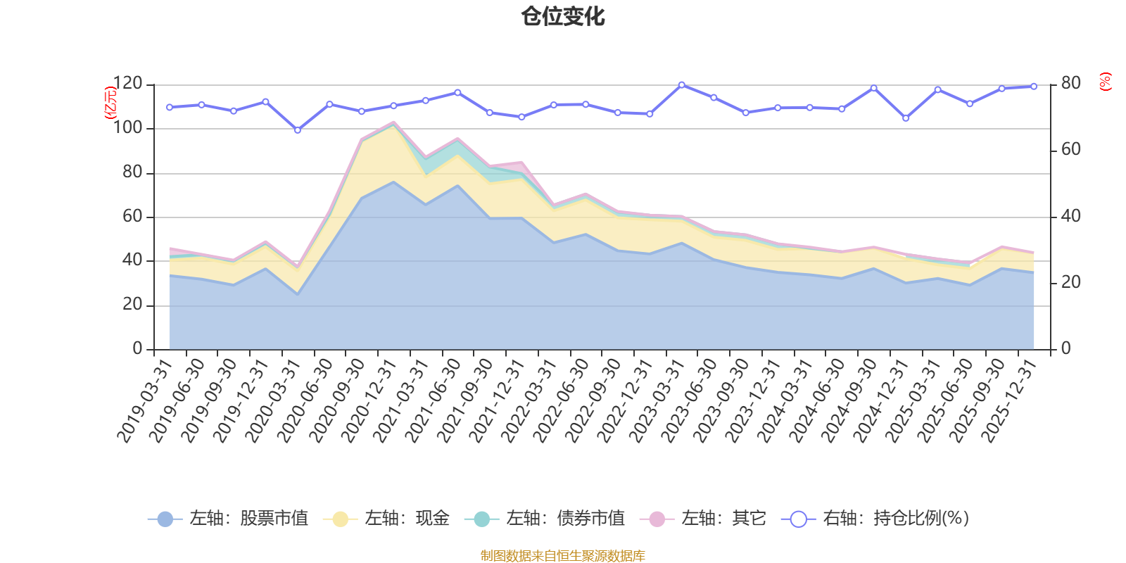 据定期报告数据统计,近三年平均股票仓位为75.46%,同类平均为72.57%。2023年一季度末基金达到79.87%的最高仓位,2020年一季度末最低,为66.21%。