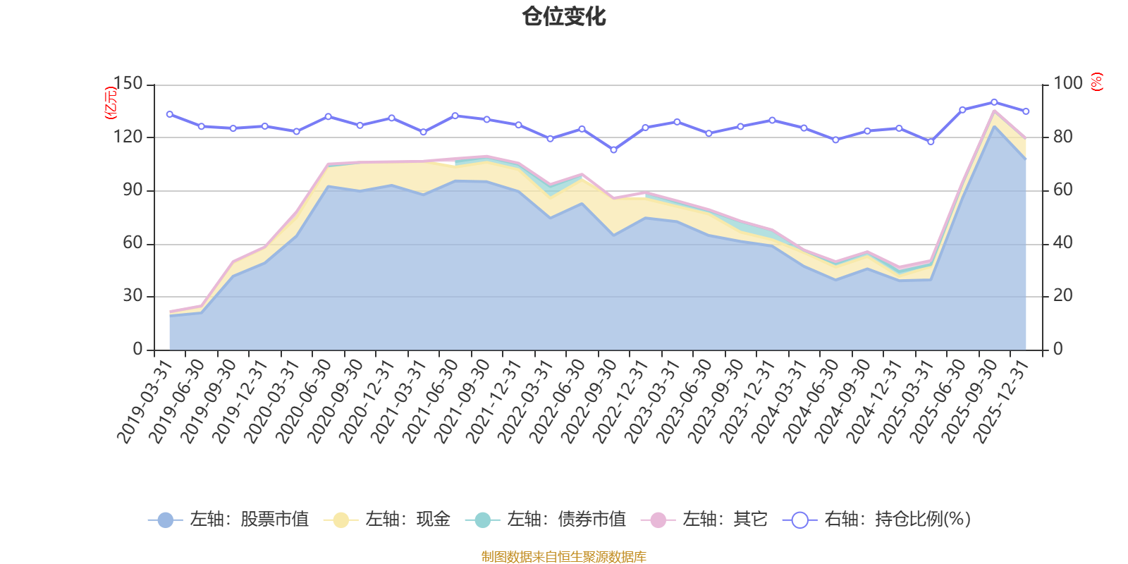 据定期报告数据统计,近三年平均股票仓位为84.97%,同类平均为86.7%。2025年三季度末基金达到93.4%的最高仓位,2022年三季度末最低,为75.43%。