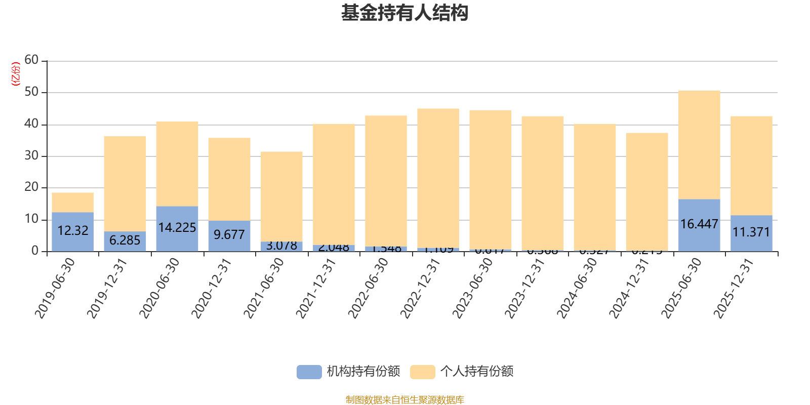 截至2025年12月31日,基金持有人共计35.55万户,合计持有42.53亿份。其中管理人员工持有1198.8万份,占比0.28%,机构持有份额占比26.74%,个人投资者占比73.26%。