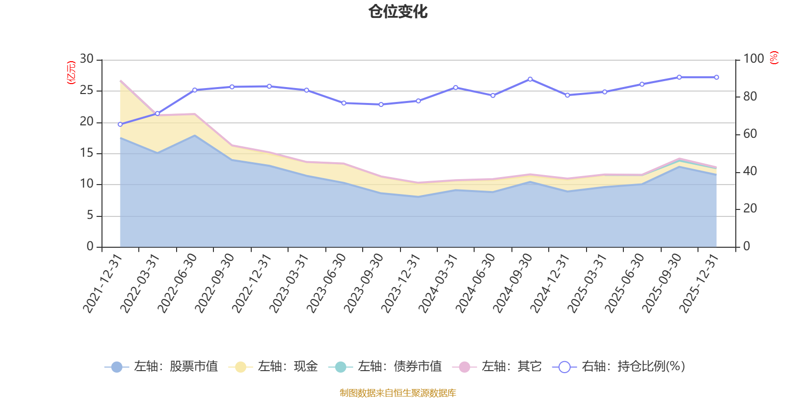 据定期报告数据统计,近三年平均股票仓位为83.53%,同类平均为87.64%。2025年三季度末基金达到90.66%的最高仓位,2021年末最低,为65.49%。