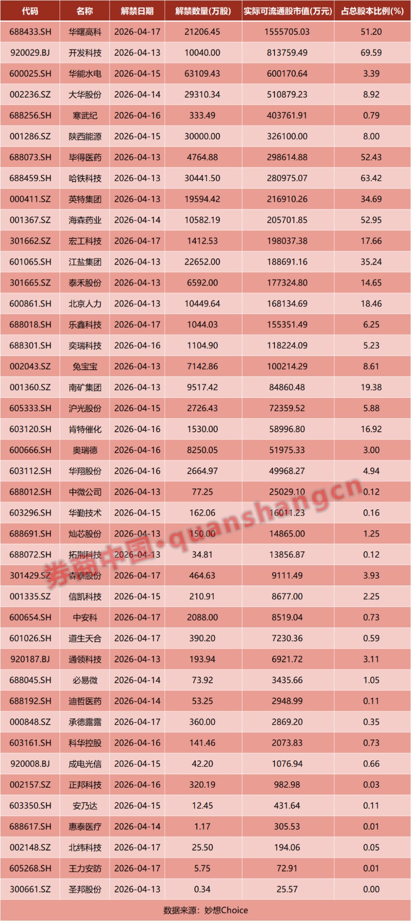 从解禁市值来看,居前三位的是:华曙高科(155.57亿元)、开发科技(81.38亿元)、华能水电(60.02亿元)。