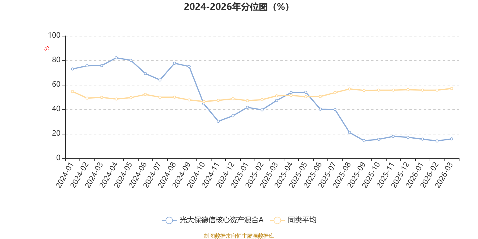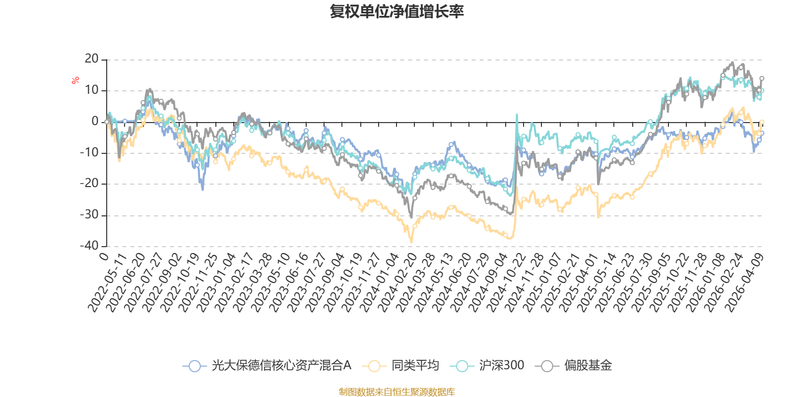 截至4月9日,光大保德信核心资产混合A近三个月复权单位净值增长率为-2.72%,位于同类可比基金414/689;近半年复权单位净值增长率为-1.24%,位于同类可比基金432/689;近一年复权单位净值增长率为17.24%,位于同类可比基金561/685;近三年复权单位净值增长率为-2.25%,位于同类可比基金294/417。