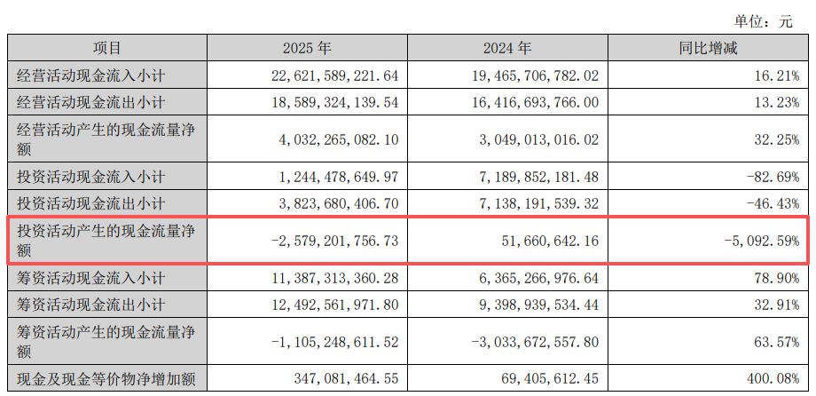 投资现金流同比转负至-25.79亿元