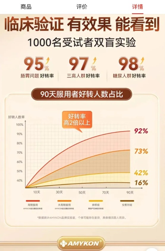 顺着消费者提供的线索,记者查询发现,该产品在详情页宣传,1000名受试者实验显示,对肠胃问题好转率达95%、“三高”人群好转率达97%、糖尿病人群好转率达98%,并通过图表形式展示“90天服用者好转效果”。此外,官方还宣传“稳控糖脂压”“调节偏高指标”等内容。