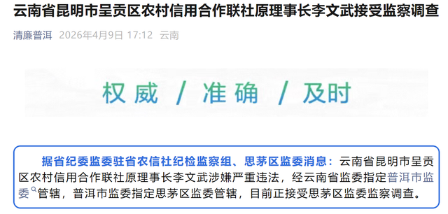 4月9日,据云南省纪委监委驻省农信社纪检监察组、思茅区监委消息:云南省昆明市呈贡区农村信用合作联社原理事长李文武涉嫌严重违法,经云南省监委指定普洱市监委管辖,普洱市监委指定思茅区监委管辖,目前正接受思茅区监委监察调查。