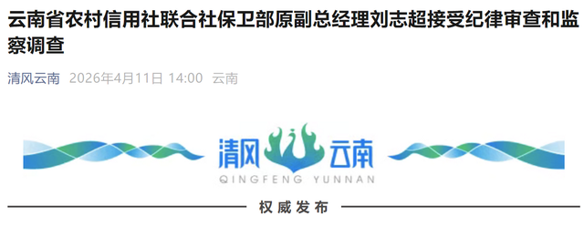 4月11日,据云南省纪委监委驻省农信社纪检监察组、沾益区监委消息:云南省农村信用社联合社保卫部原副总经理刘志超涉嫌严重违纪违法,目前正接受省纪委监委驻省农信社纪检监察组纪律审查;经省监委指定曲靖市监委管辖,曲靖市监委指定沾益区监委管辖,正接受沾益区监委监察调查。
