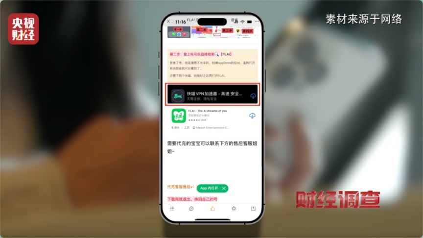 根据商家指引,记者登录境外应用市场并下载到这款“flai”AI聊天软件,若想顺利打开“flai”软件还需要下载名为“快喵”的VPN加速器。