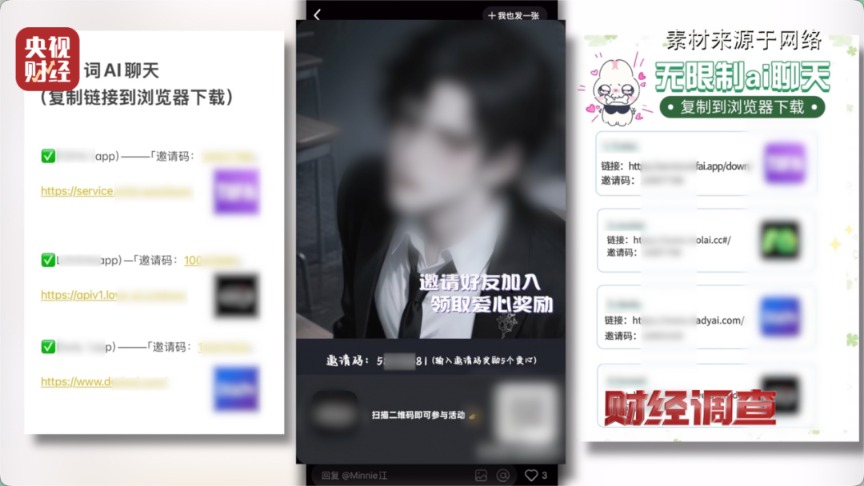 同样,记者在某短视频平台上搜索“AI聊天软件推荐”,在搜索结果中也看到,各种分享推广的热聊帖子,在帖子主页以及评论区中,老用户们互相分享、推荐自己喜欢的AI聊天软件,同时邀请新用户进入分享群。