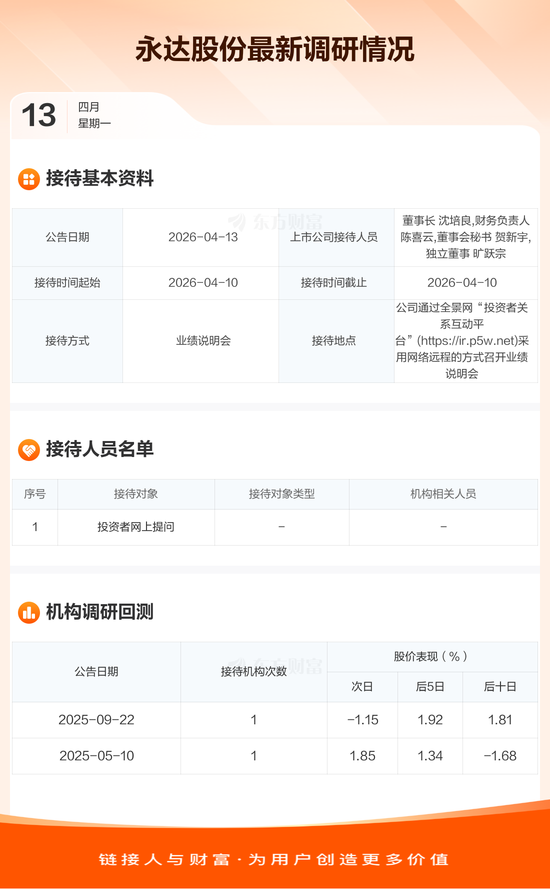 永达股份4月13日公告称,4月10日接待投资者网上提问等1家机构调研。接待人员包括董事长 沈培良,财务负责人 陈喜云,董事会秘书 贺新宇,独立董事 旷跃宗。
