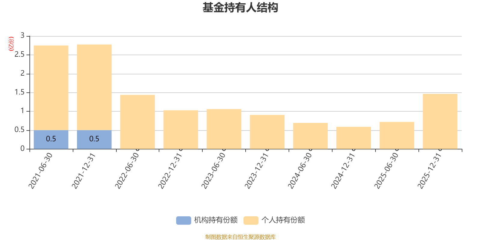 截至2025年12月31日,基金持有人共计1.08万户,合计持有1.46亿份。其中管理人员工持有21.29万份,占比0.15%,机构持有份额占比0.00%,个人投资者占比100.00%。