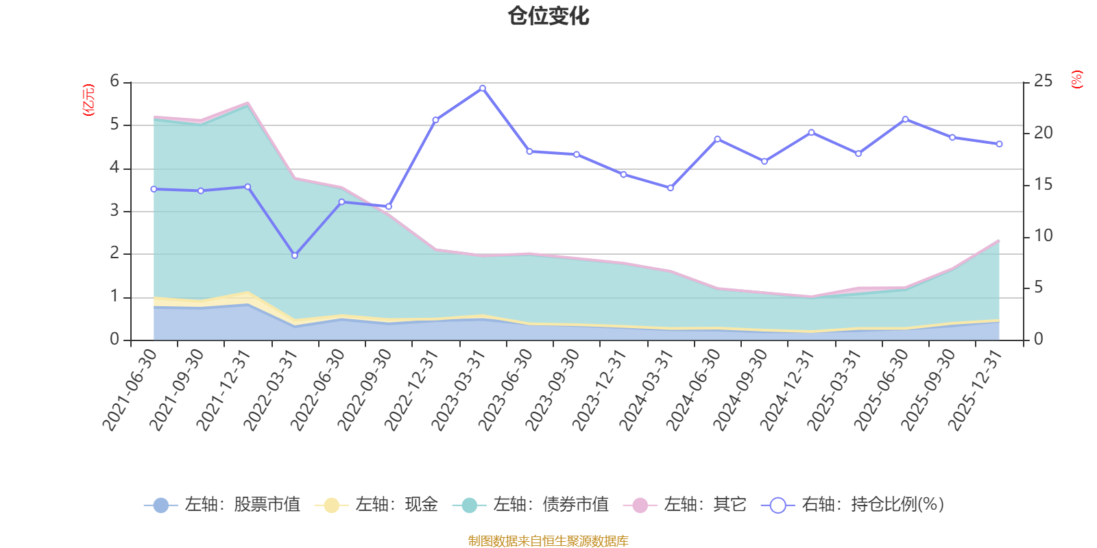 据定期报告数据统计,近三年平均股票仓位为18.89%,同类平均为19.2%。2023年一季度末基金达到24.42%的最高仓位,2022年一季度末最低,为8.2%。