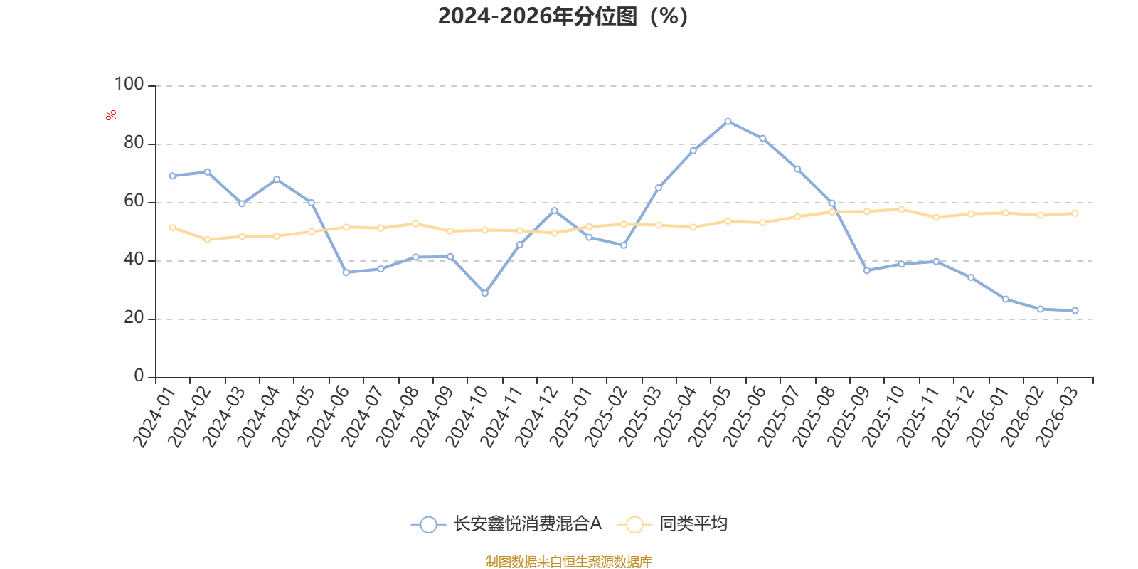 通过所选区间该基金净值增长率分位图,可以观察该基金与同类基金业绩比较情况。图为坐标原点到区间内某时点的净值增长率在同类基金中的分位数。