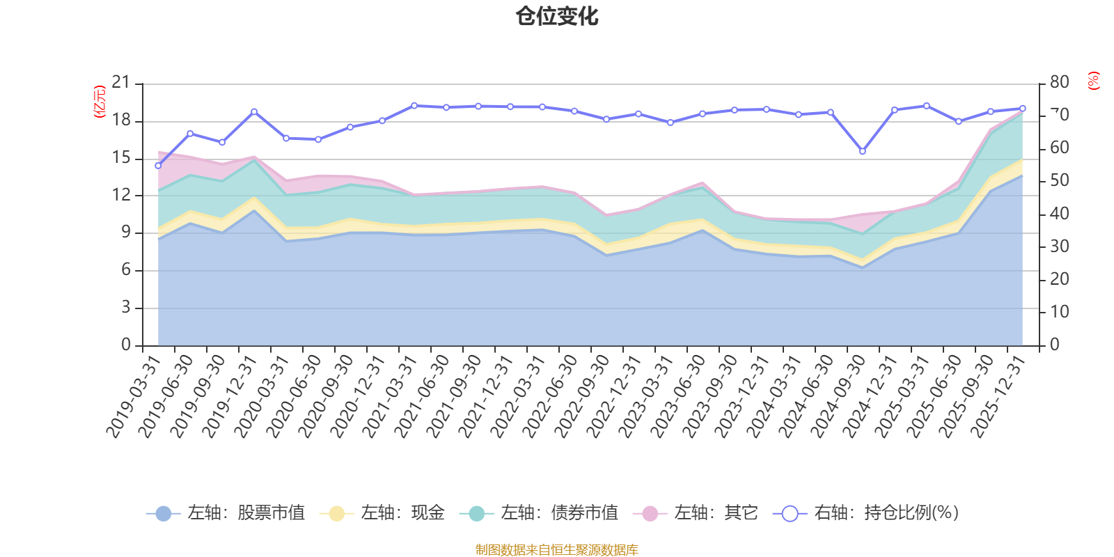 据定期报告数据统计,近三年平均股票仓位为70.12%,同类平均为72.57%。2021年一季度末基金达到73.27%的最高仓位,2019年一季度末最低,为54.94%。
