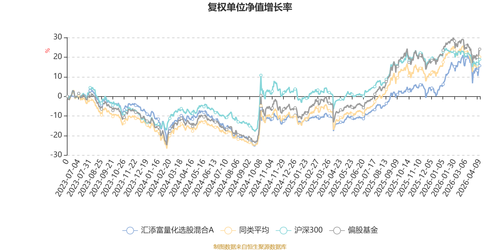 截至4月9日,汇添富量化选股混合A近三个月复权单位净值增长率为5.32%,位于同类可比基金116/689;近半年复权单位净值增长率为10.26%,位于同类可比基金140/689;近一年复权单位净值增长率为37.05%,位于同类可比基金340/685。